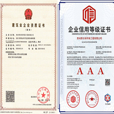 公司取得中華人民共和國(guó)住建部頒發(fā)的建筑機(jī)電安裝工程和環(huán)保工程專業(yè)承包三級(jí)資質(zhì),獲得3A級(jí)企業(yè)信用評(píng)價(jià)等級(jí)證書(shū),標(biāo)志著公司的軟硬實(shí)力和信譽(yù)度的提升。