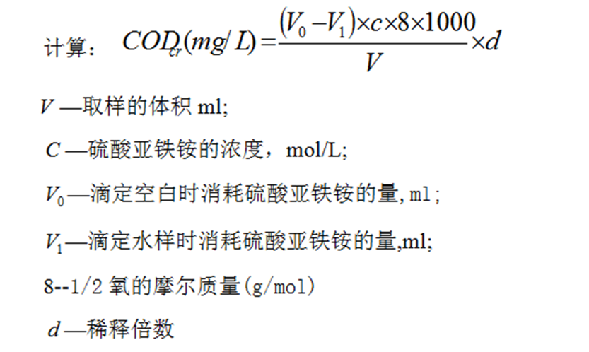 在強酸性溶液中,一定量的重鉻酸鉀氧化(以Ag+作此反應的催化劑)水樣中的還原性物質(zhì)(有機物),過量的重鉻酸鉀以試亞鐵靈作指示劑,用硫酸亞鐵銨溶液回滴。根據(jù)用量計算出水樣中還原性物質(zhì)消耗氧的量。